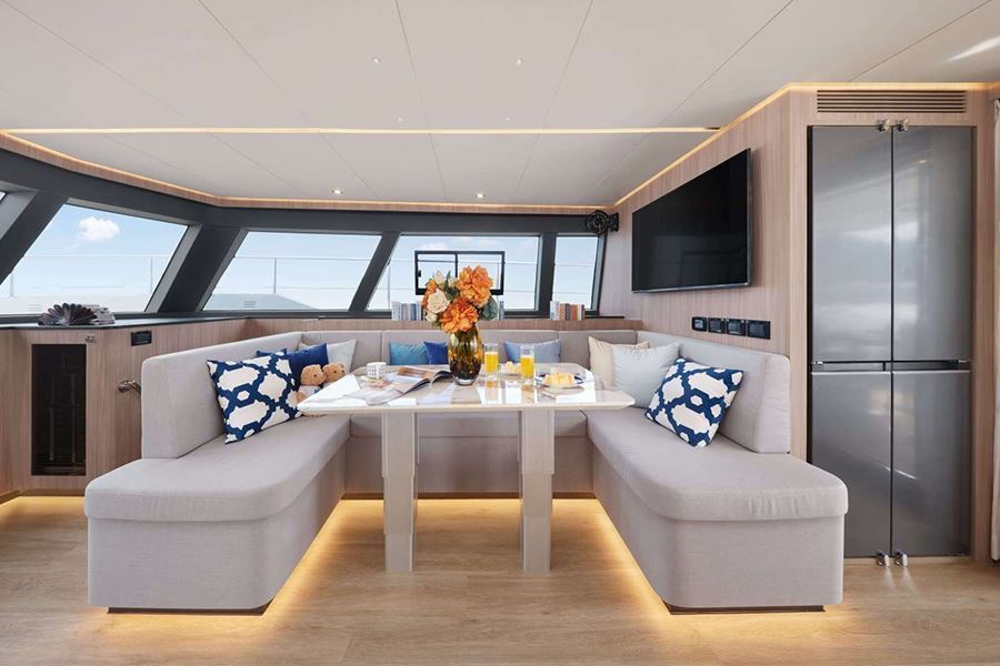 Il salone principale è il cuore della vita a bordo, con comode sedute e grandi vetrate che regalano una vista continua sul Mediterraneo. La cucina, moderna e completamente attrezzata, permette di preparare ogni tipo di pasto, dagli snack informali alle cene più curate, alternando la vita di bordo alle soste nelle tipiche taverne sul mare.