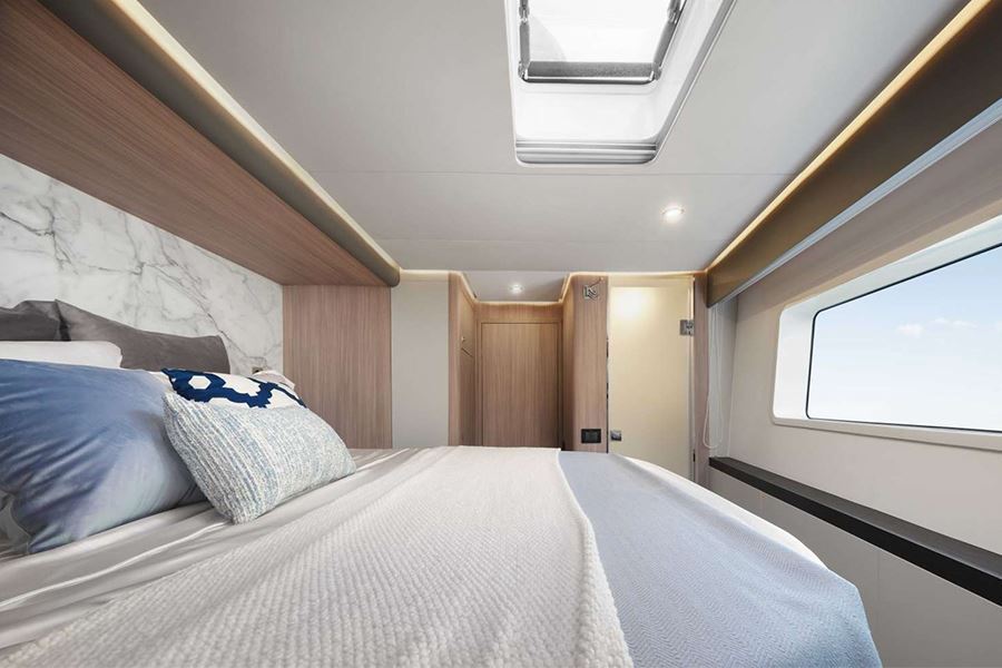 La cabina armatoriale è un vero rifugio sul mare, con ampie finestre panoramiche che incorniciano il paesaggio greco. A tutta larghezza, dispone di bagno privato e generosi spazi di stivaggio, ideali anche per charter di lunga durata. Arredi e finiture sono curati nei minimi dettagli, a conferma dell’alto livello di comfort offerto.