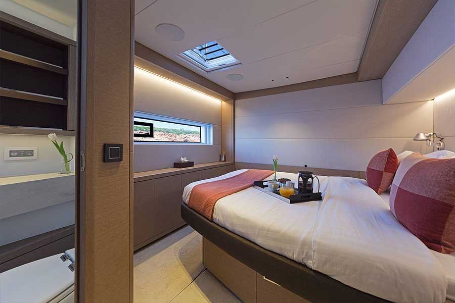Con un design elegante e innovativo assicura una esperienza di navigazione unica fra le isole greche. Il salone principale, ricco di spazi e luce naturale, rende la crociera lussuosa e confortevole, mentre la cabina armatoriale consente un rapido accesso dal salone e, come le altre 4 cabine ospiti, offre visuali incredibili attraverso le ampie finestre. A bordo, un sistema audio ad alta tecnologia con 25 altoparlanti permette di personalizzare l'ascolto in ogni cabina e nell'area esterna.