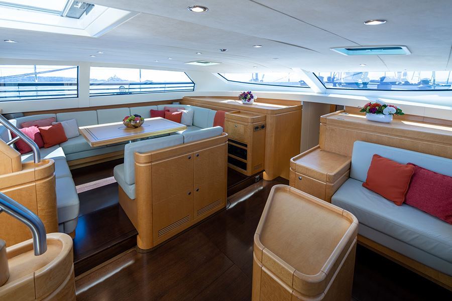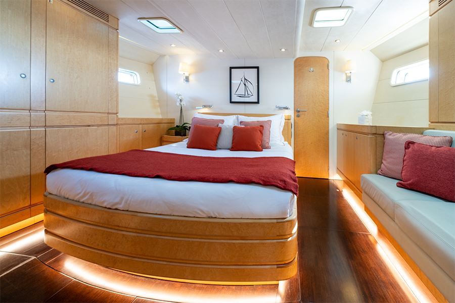 Gli interni sono spaziosi e raffinati, con ambienti pensati per accogliere fino a 6 ospiti in 3 cabine: una master suite a tutta larghezza, una cabina matrimoniale e una cabina doppia con letti separati. Ogni spazio è progettato per garantire comfort, privacy e un’atmosfera calda e accogliente anche nelle latitudini del Nord.