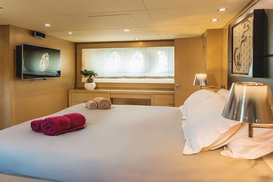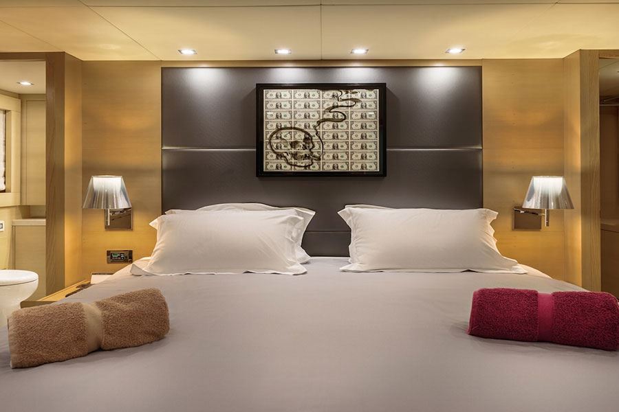 I suoi interni moderni, con opere d'arte sorprendenti, sono composti da quattro cabine: una cabina armatoriale, una cabina VIP e due cabine doppie convertibili, tutte con servizi privati.