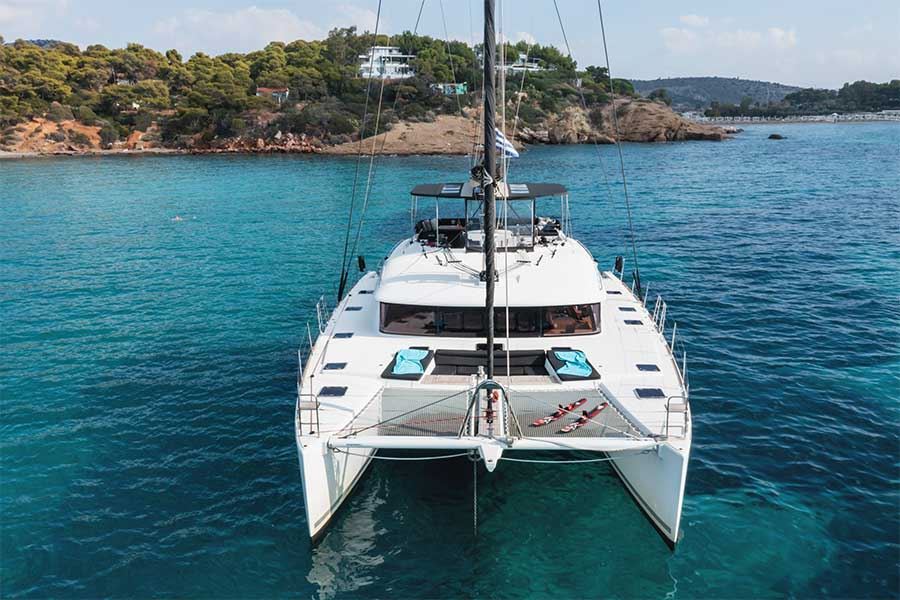 Moya è il bellissimo catamarano Lagoon 560, disponibile per charter con equipaggio in Grecia, con 5 cabine e 5 bagn, perfetto per gruppi fino a 10 ospiti.