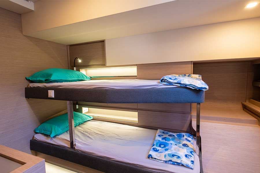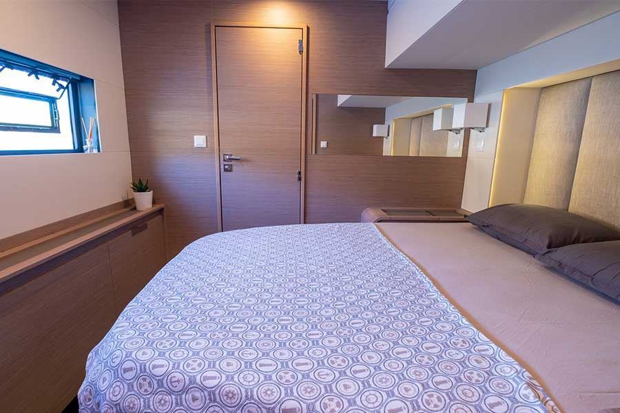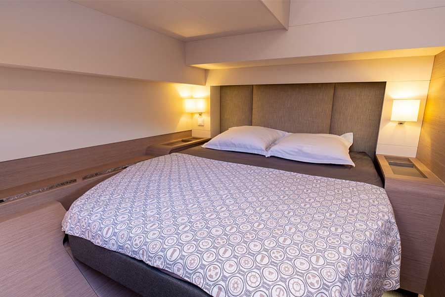Con 5 cabine spaziose, tra cui una suite armatoriale di 22 m² con accesso diretto al salone anteriore, può ospitare fino a 10 persone. A bordo troverai 3 cabine matrimoniali, 1 cabina doppia con letti a castello e 5 bagni, tutti progettati per il massimo comfort.