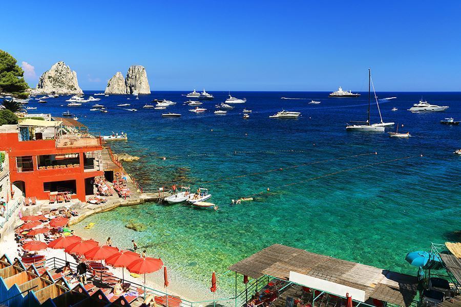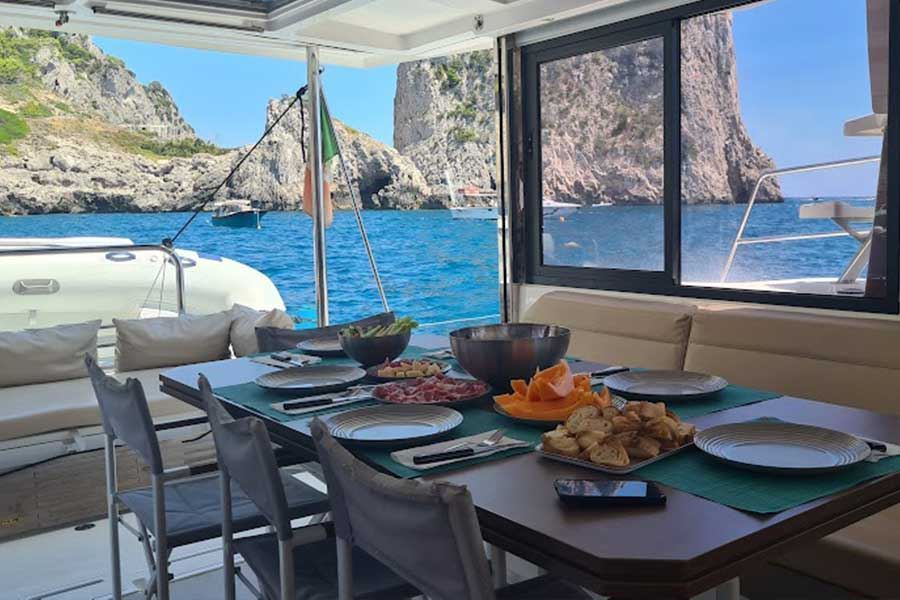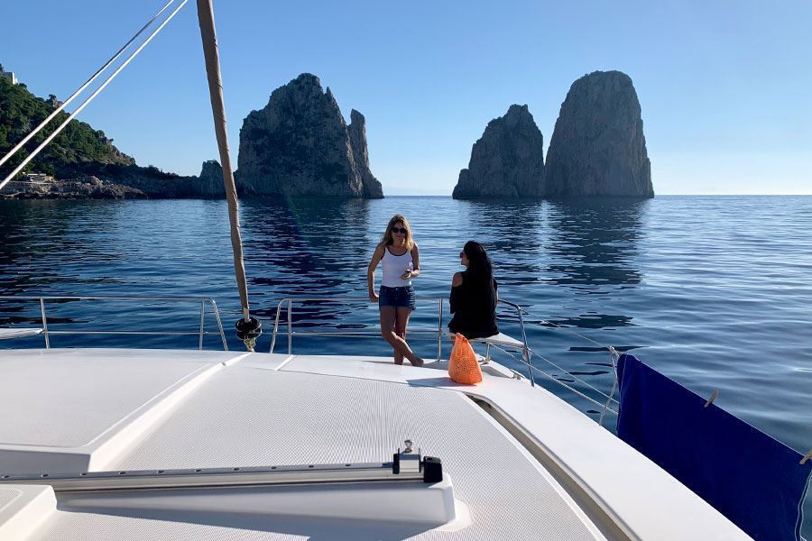 Prima tappa a Sant’Angelo d’Ischia, con il suo elegante borgo pedonale e la baia di Sorgeto, dove le sorgenti termali si mescolano all’acqua di mare creando un’esperienza di bagno unica. Da qui si fa rotta verso Capri, che accoglie i naviganti con i suoi celebri Faraglioni, le grotte e le calette dall’acqua color smeraldo. Un giro in Piazzetta e un aperitivo al tramonto sono rituali da non perdere sull’Isola Azzurra.