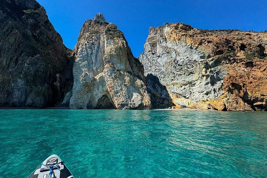 Esplorazione di Palmarola. Nel pomeriggio trasferimento in catamarano verso Ponza (circa 2 ore). Meteo permettendo: traversata in SUP tra le due isole (catamarano sempre a vista). Relax e notte in rada.
