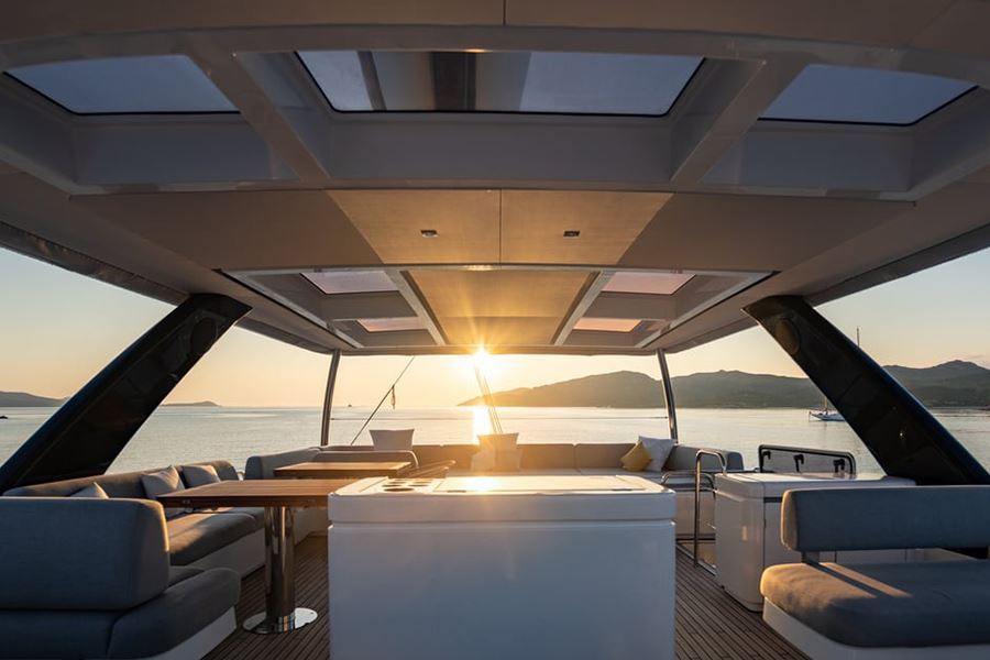 Dotazioni esterne: flybridge, timone a ruota, ponte e pozzetto in teak, bimini, verricello elettrico, doccia esterna, scaletta bagno, prendisole, tavolo pozzetto, cuscineria esterna, passerella, tender con motore fuoribordo e cime di ormeggio.