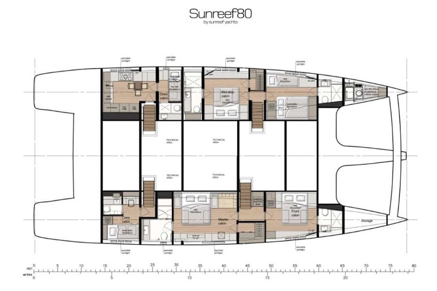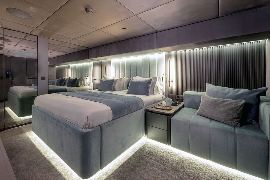 Gli spazi interni sono generosi e pensati per garantire privacy e comfort assoluto. La master cabin, situata a centro barca sul lato di dritta, dispone di letto king-size, area relax con divanetto, toeletta, cabina armadio e un ampio bagno con doccia. Sempre a dritta si trova una cabina doppia con letto queen-size e bagno privato. Sul lato di sinistra, a centro barca, la cabina VIP offre spazi ancora più ampi, cabina armadio e bagno en suite di dimensioni superiori. A prua, una cabina ospiti con tre comodi letti singoli e bagno privato completa la zona notte, rendendo lo yacht perfetto per famiglie o gruppi di amici.